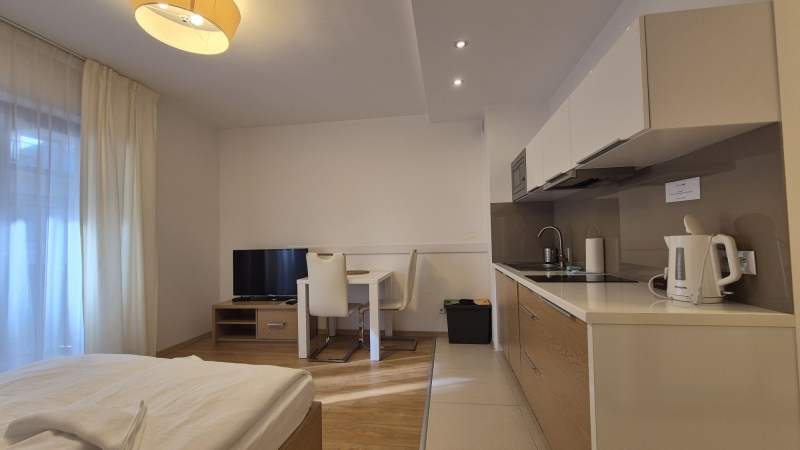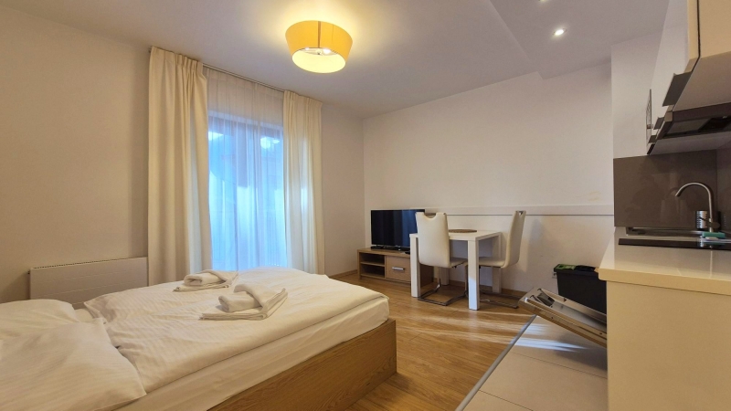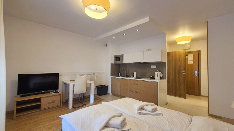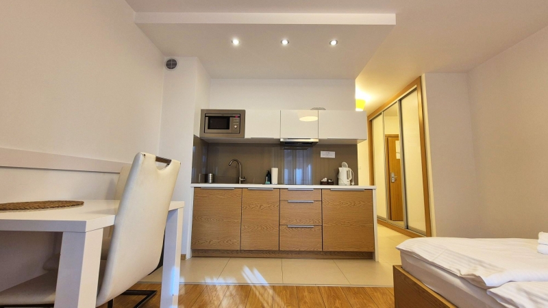 OPIS APARTAMENTU -Kompaktowy apartament typu studio o powierzchni 27,06m2. Lokal składa się aneksu kuchennego połączonego z pokojem dziennym z którego jest wyjście na balkon, łazienki oraz przedpokoju. Apartament sprzedawany jest z pełnym wyposażeniem. -Do apartamentu przynależy indywidualne miejsce postojowe na terenie posesji w cenie dodatkowo 20.000 zł -Opłaty miesięczne do wspólnoty mieszkaniowej wynoszą około 220 zł.