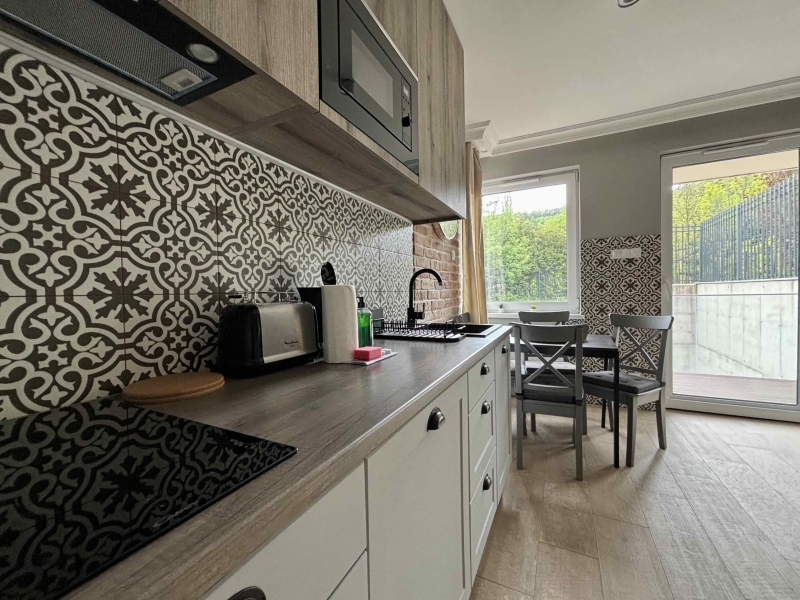 OPIS NIERUCHOMOŚCI -apartament typu studio o pow. 27,65m2 - pokój z aneksem kuchennym z wyjściem na balkon, przedpokój, łazienka. -lokal w pełni umeblowany i wyposażony w zabudowę kuchenną wraz ze sprzętem AGD. -apartament znajduje się w nowym budynku, który wyposażony jest w windę. -indywidualne miejsce parkingowe w garażu podziemnym