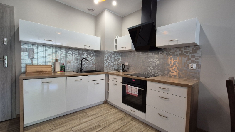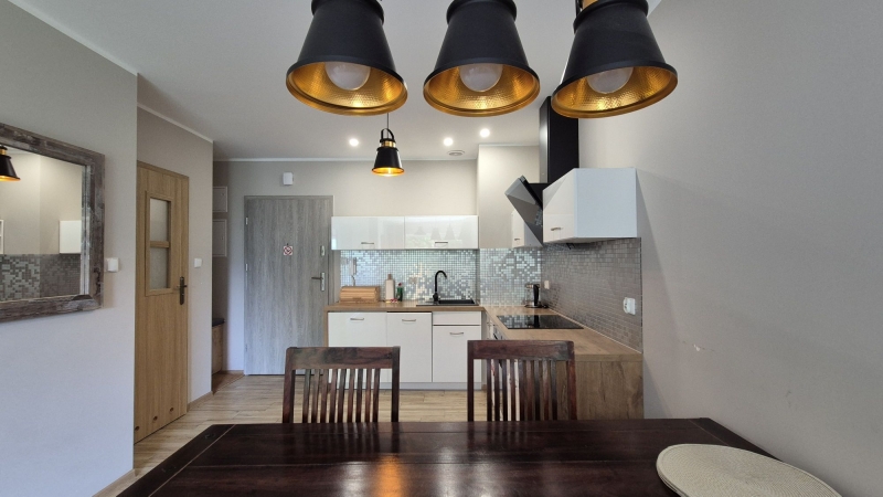 -lokal w pełni umeblowany i wyposażony: kuchnia z meblami w zabudowie wraz ze sprzętem AGD; w jadalni duży stół; sypialnia z łóżkiem małżeńskim oraz TV; łazienka z prysznicem i odpływem liniowym, dodatkowo pralka
