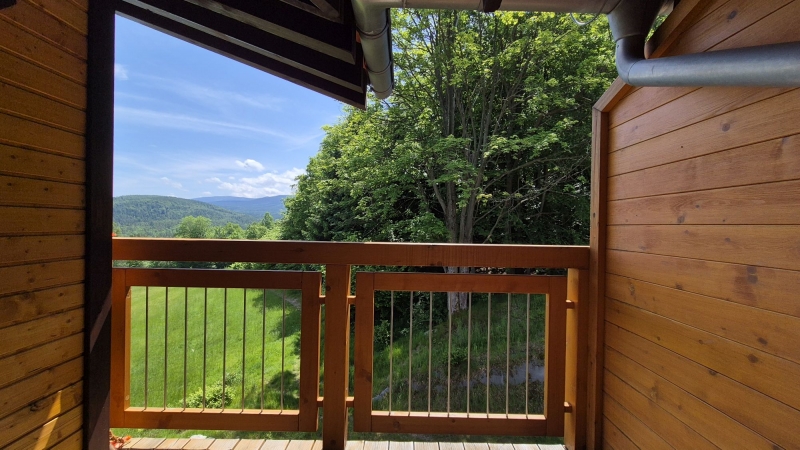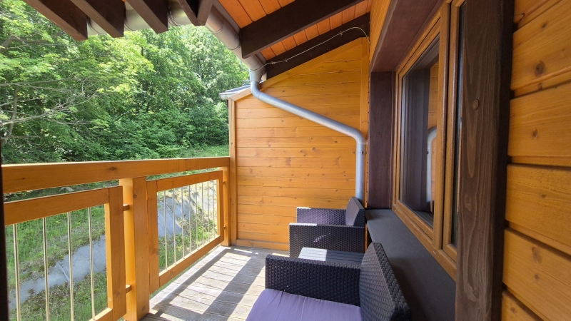 -z salonu wyjście na zadaszony balkon z niepowtarzalnym widokiem na zieleń, góry oraz Kotlinę Jeleniogórską, dodatkowo salon posiada duże panoramiczne okno z wystawą południową, dzięki czemu mamy wrażenie że natura "wchodzi do mieszkania"